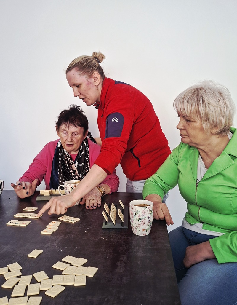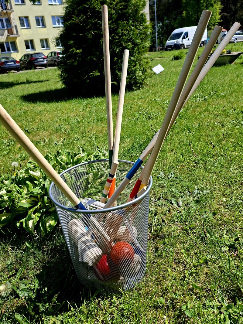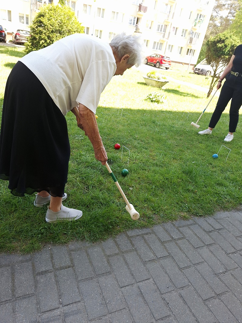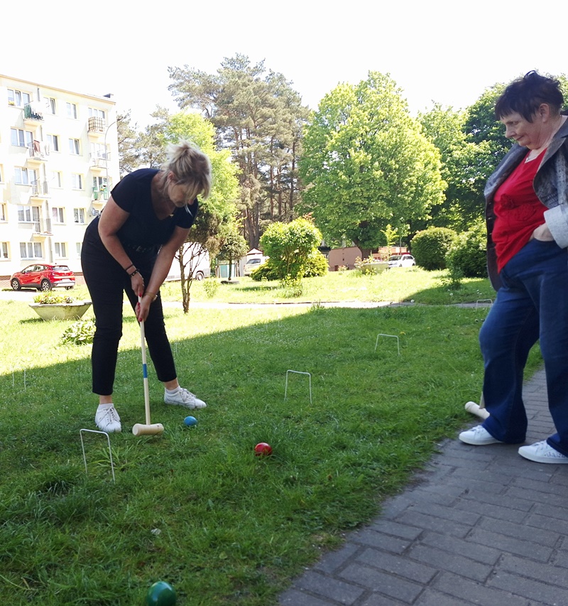 W maju w Dziennym Domu Senior+ nauczyliśmy się grać w krokieta. Krokiet to nie tylko zapiekany naleśnik z farszem. To też dawna, tradycyjna gra dworska, czasem mylona z krykietem. Nazwa “krokiet” wywodzi się od francuskiego croquet, co oznacza zagięty kij, gdyż takich kijów używano dawniej w jednej z wersji tej gry. Jak się gra w krokieta? W najpopularniejszych odmianach celem gry jest przebicie kuli za pomocą drewnianego, młotkowatego kija przez różnie rozstawione 6 lub 9 bramek, a następnie trafienie w drewniany palik (lub paliki), ustawiony na końcu bądź w środku pola gry.