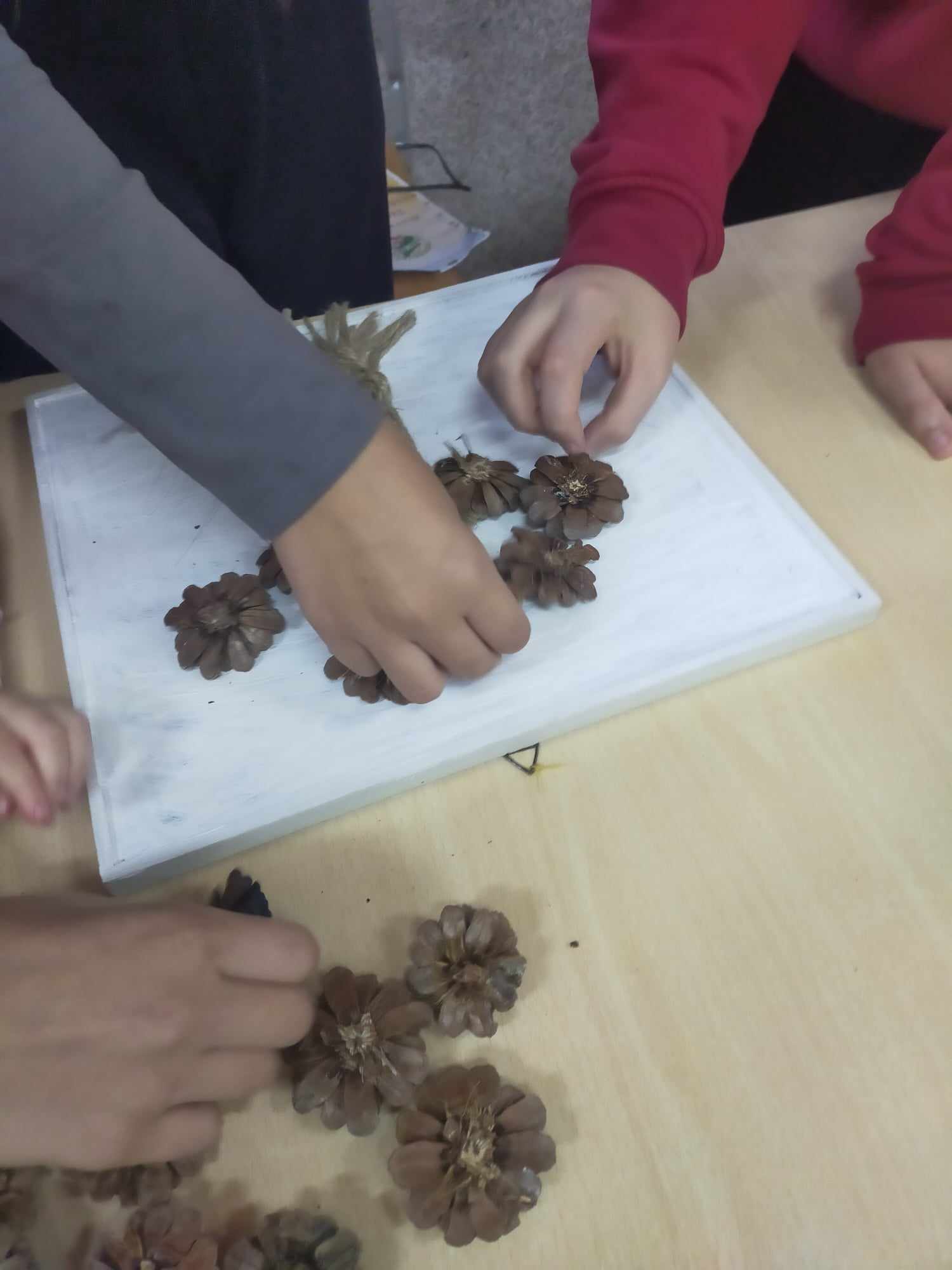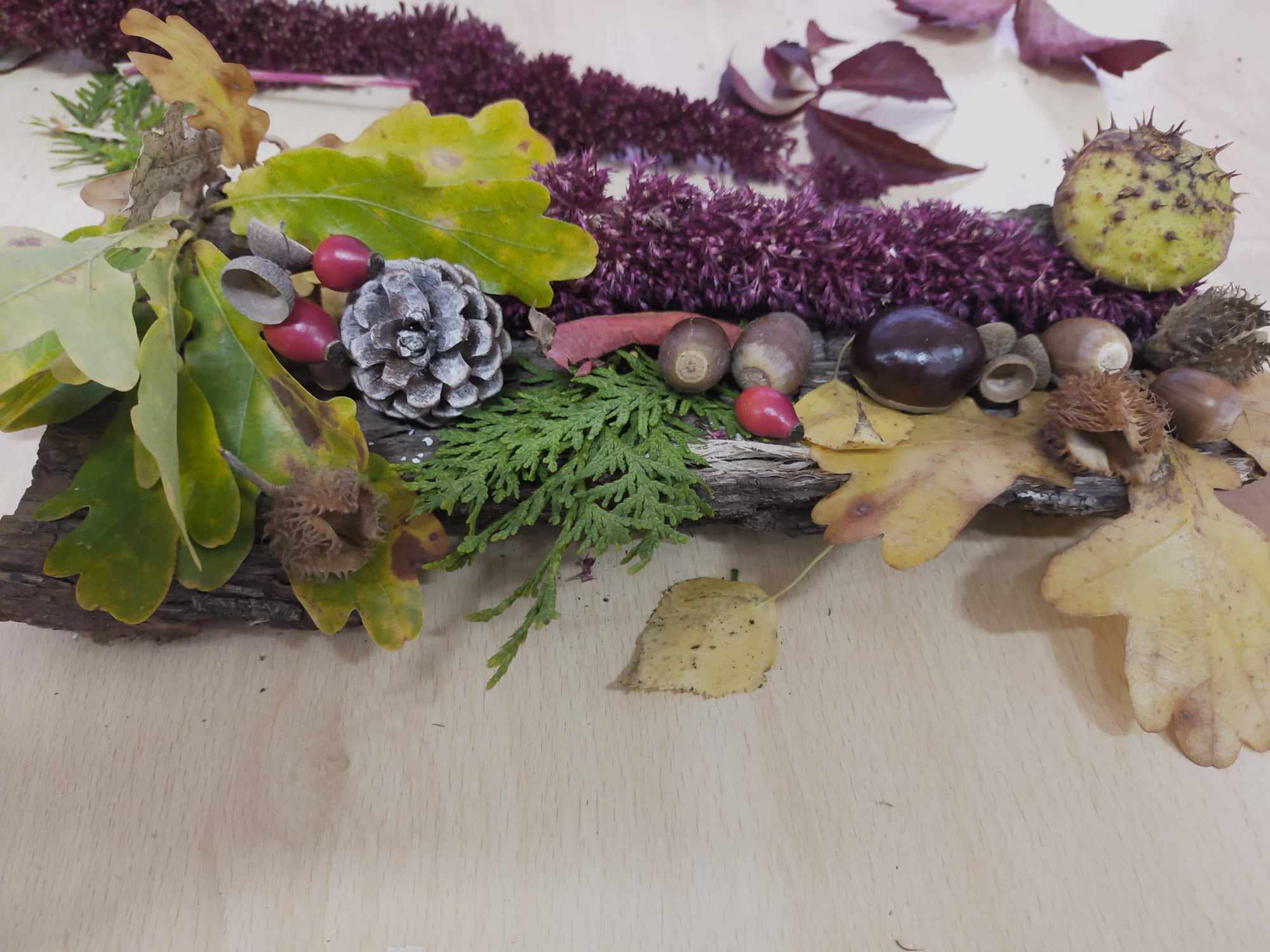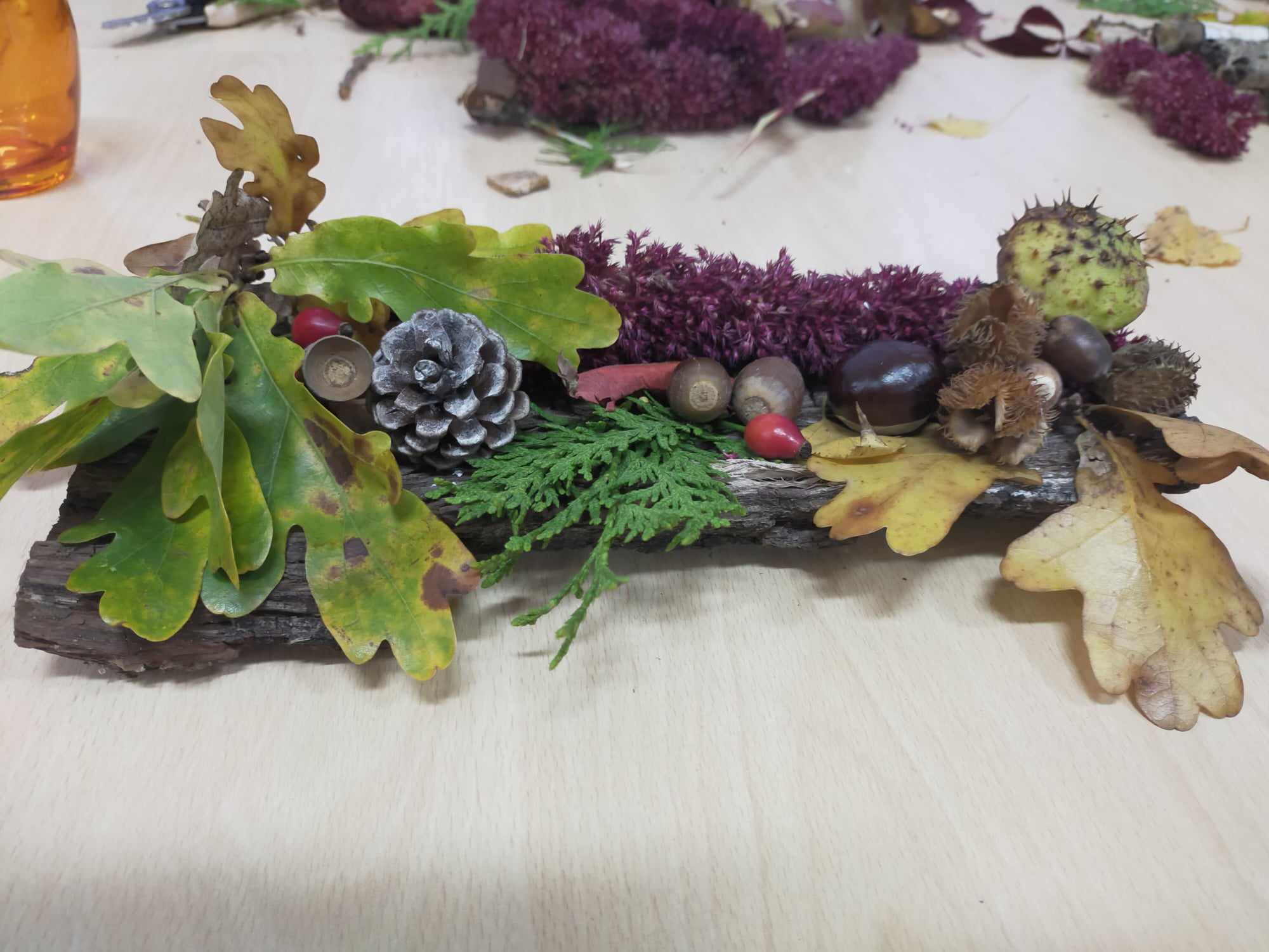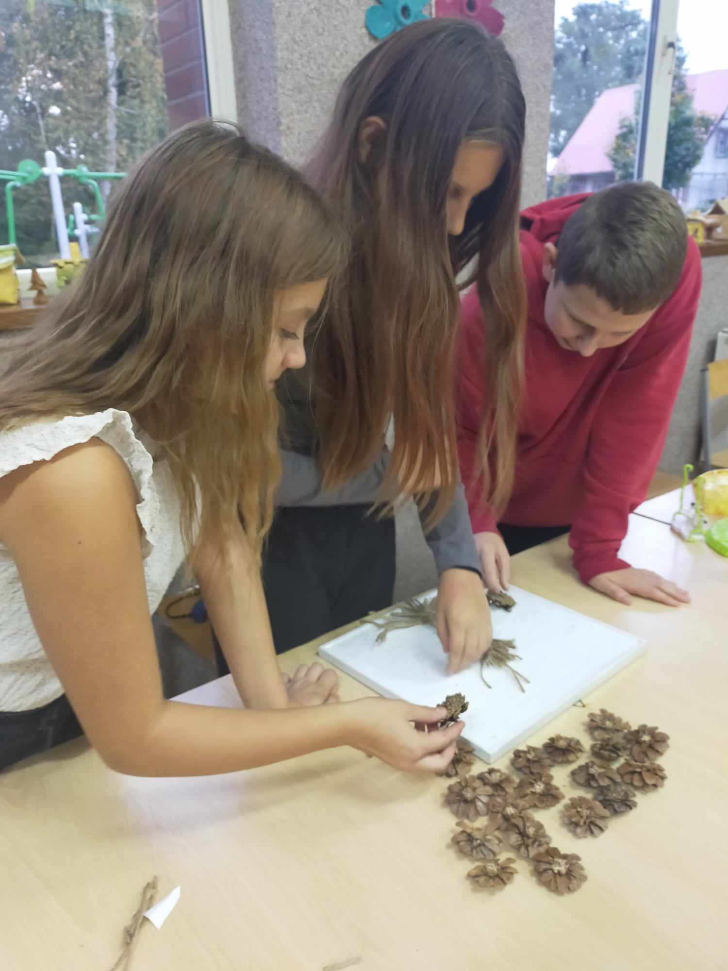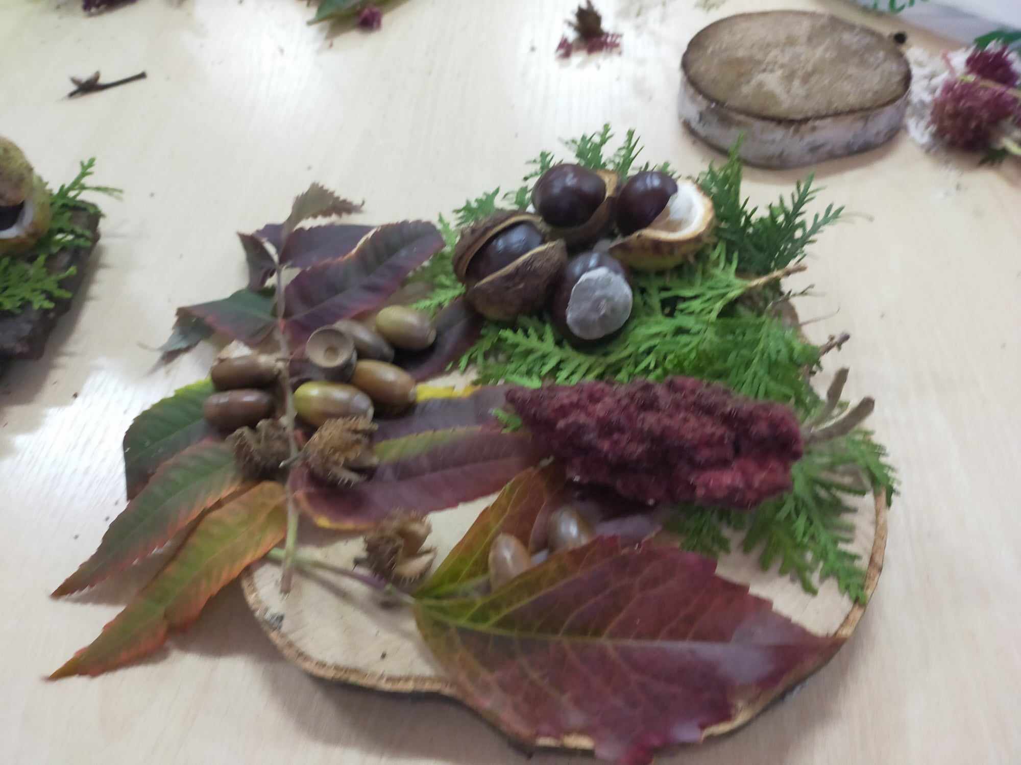 Podczas zajęć kształtowaliśmy umiejętność wykorzystania darów jesieni - zbieranie kasztanów, szyszek, liści klonu, które wykorzystane zostały do wspólnych prac rozwijających kreatywne umiejętności manualne wychowanków. Dzięki tym zajęciom powstały jesienne stroiki, obrazy z szyszek, róże z liści.