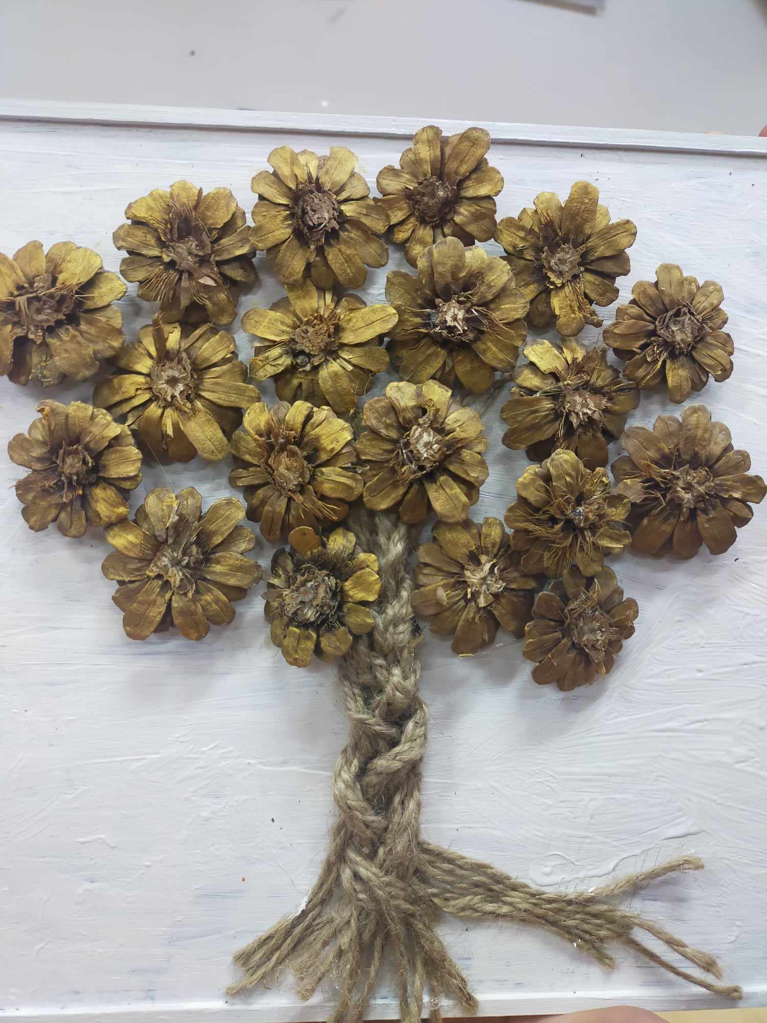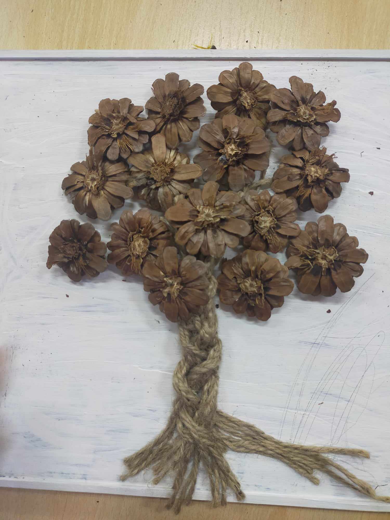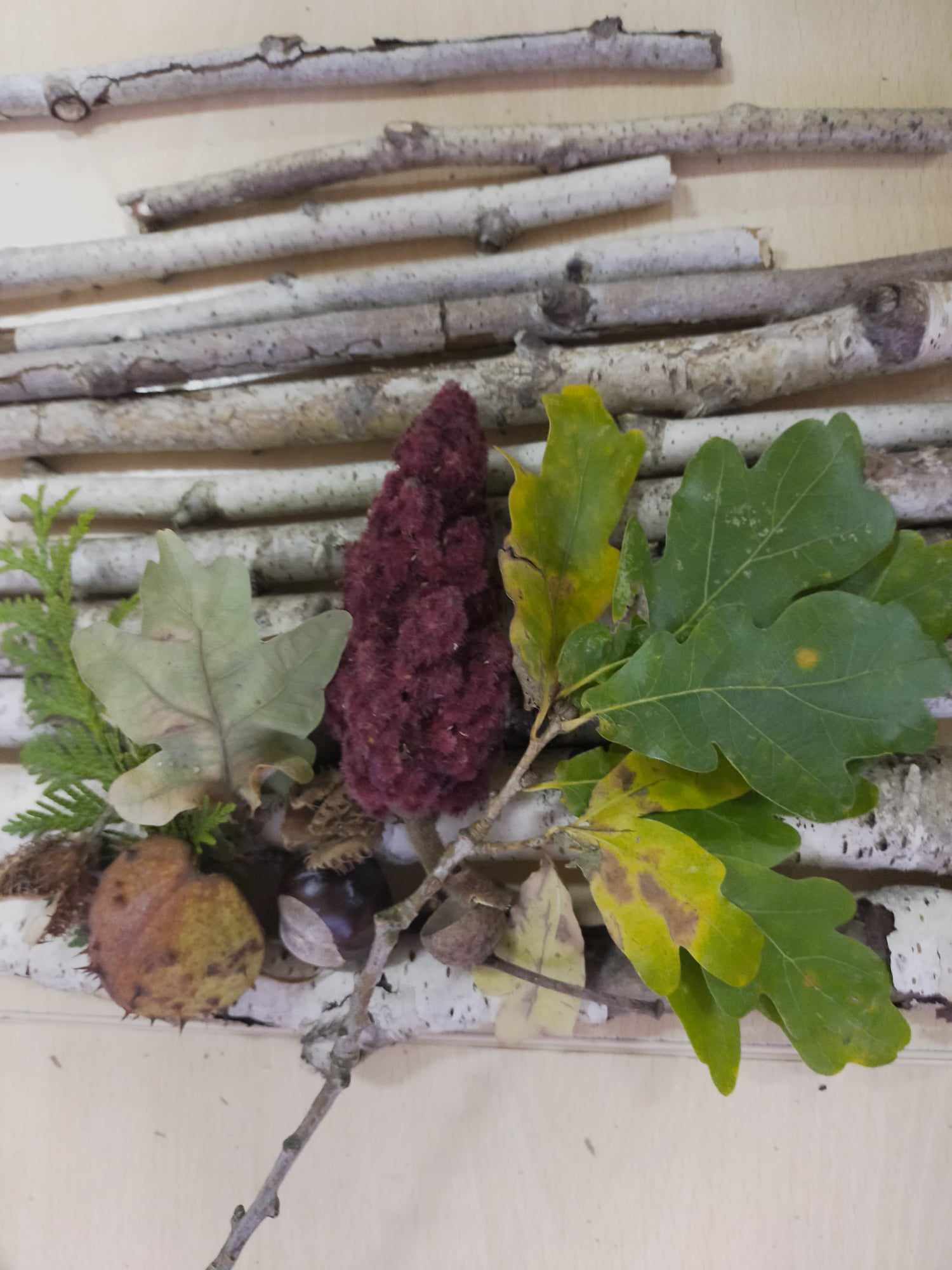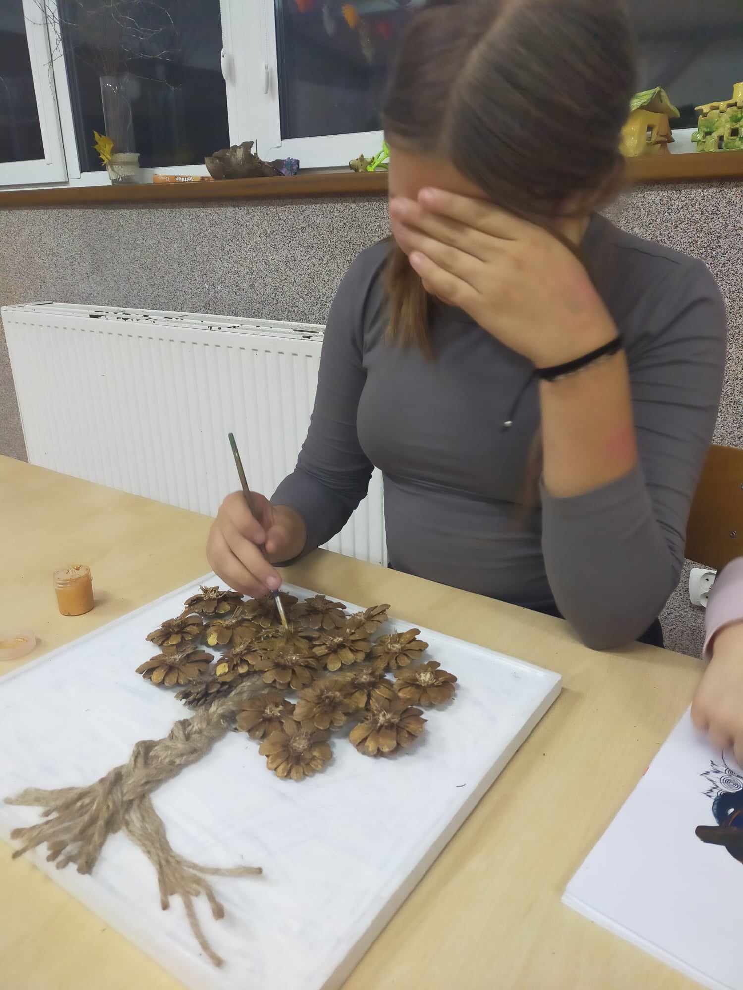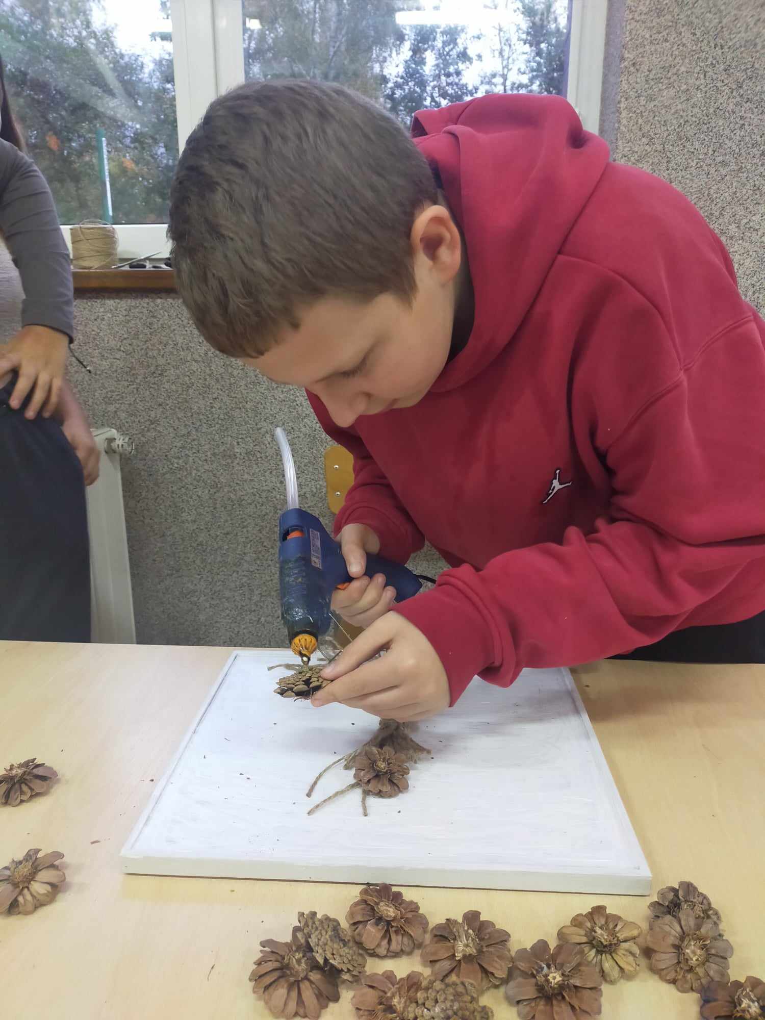 Podczas zajęć kształtowaliśmy umiejętność wykorzystania darów jesieni - zbieranie kasztanów, szyszek, liści klonu, które wykorzystane zostały do wspólnych prac rozwijających kreatywne umiejętności manualne wychowanków. Dzięki tym zajęciom powstały jesienne stroiki, obrazy z szyszek, róże z liści.