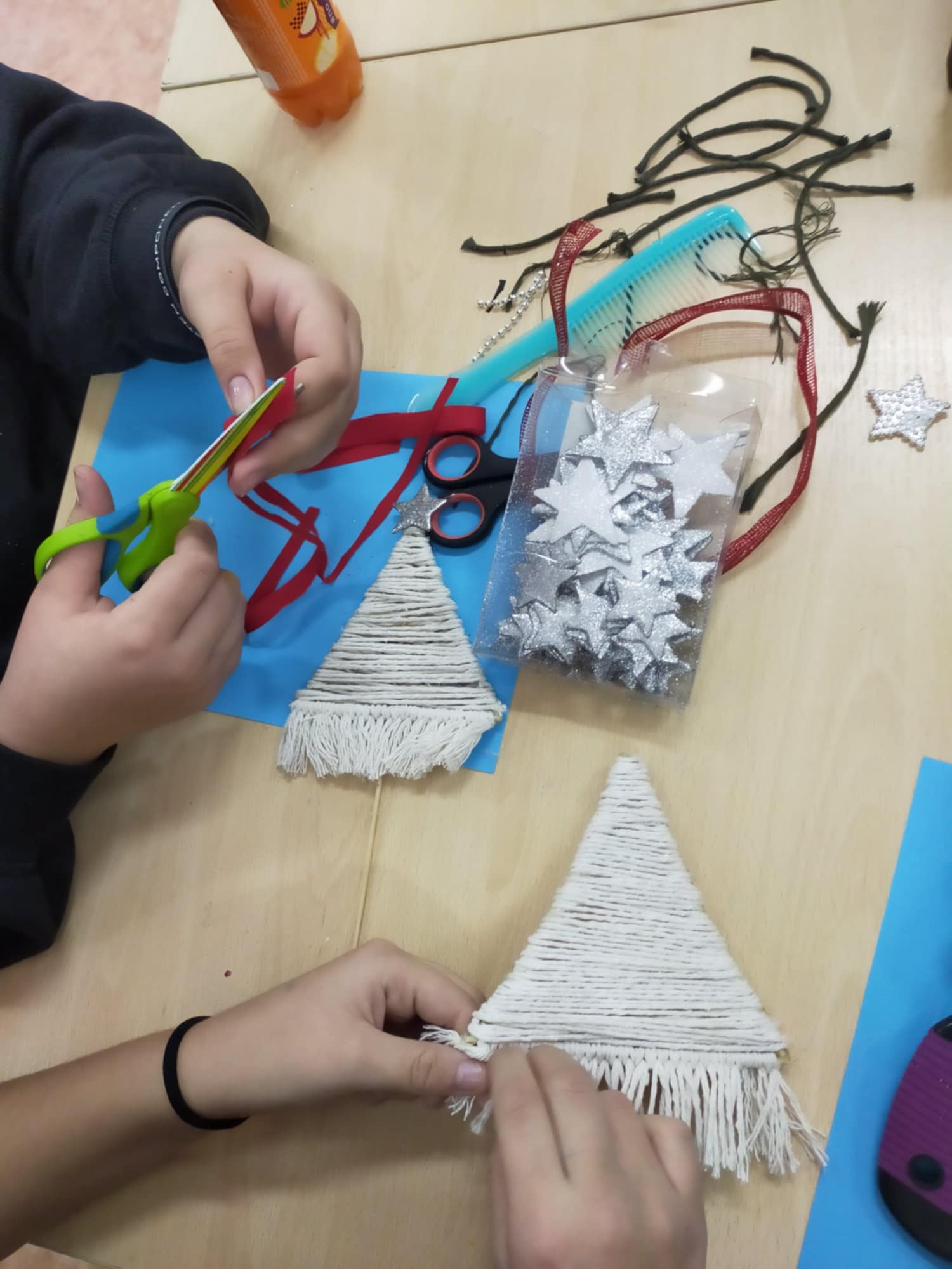Rozpoczęliśmy również wykonywanie ozdób świąteczno - zimowych, gwiazdy z papieru, choinki z patyczków i włóczki .