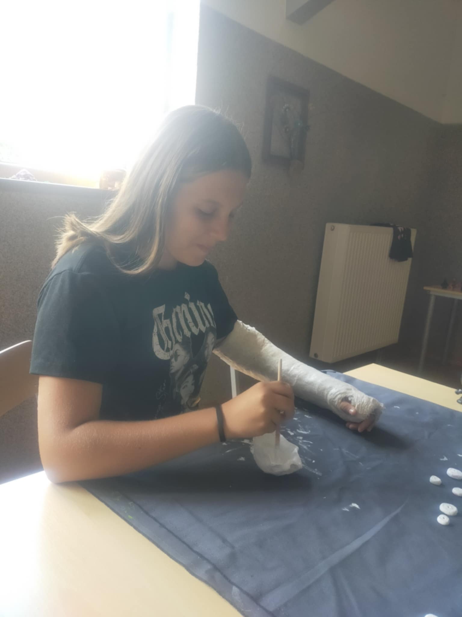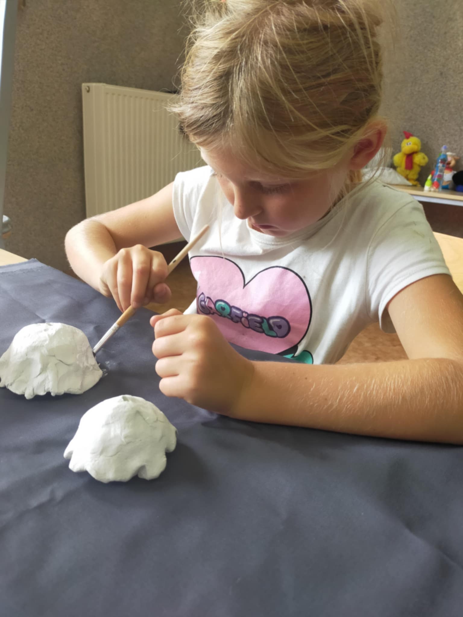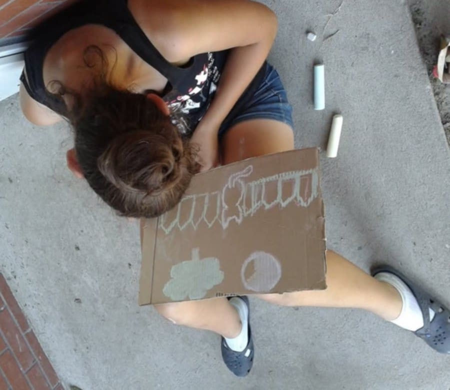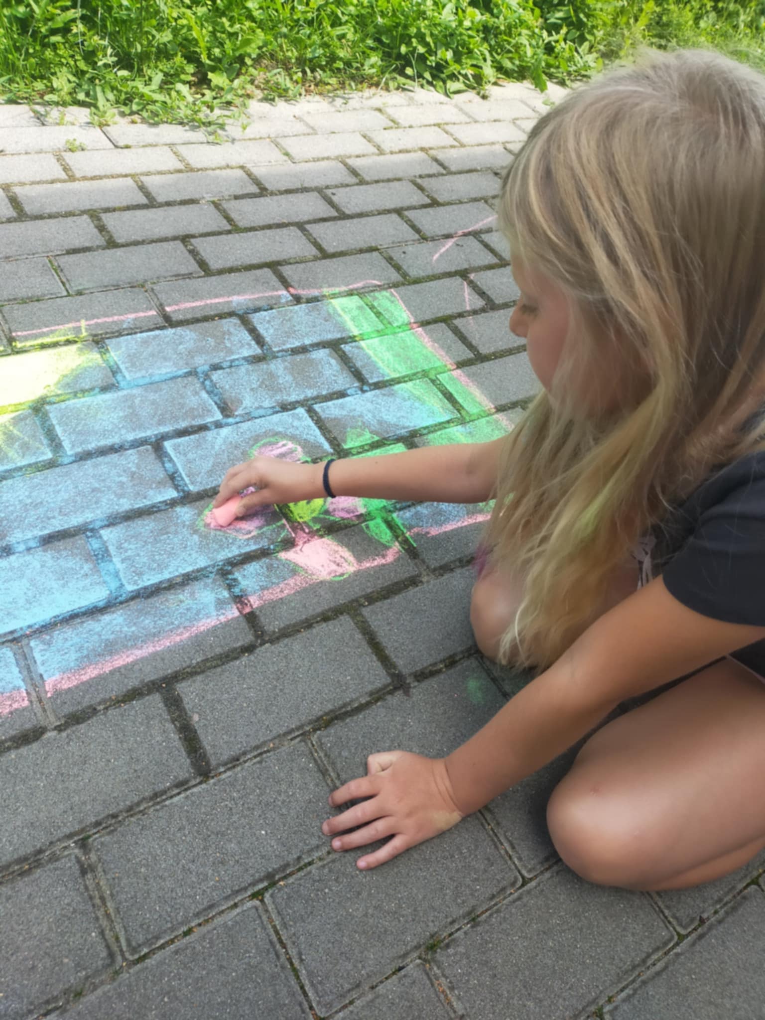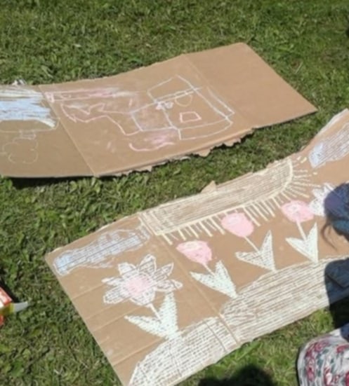• malowaniu kredą na dużych kartonach – co stanowiło zarówno formę ekspresji plastycznej, jak i zabawy sensorycznej,